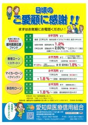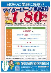 | ◆多目的ローン(事業資金を除く) ◎資金使途:マイカー、教育以外の 資金使途が明確なもの ◎金額:2千万円まで ◎期間:10年以内 15年以内(リフォーム資金) 完済時年齢 満80歳まで ◎金利:年1.8%~ |